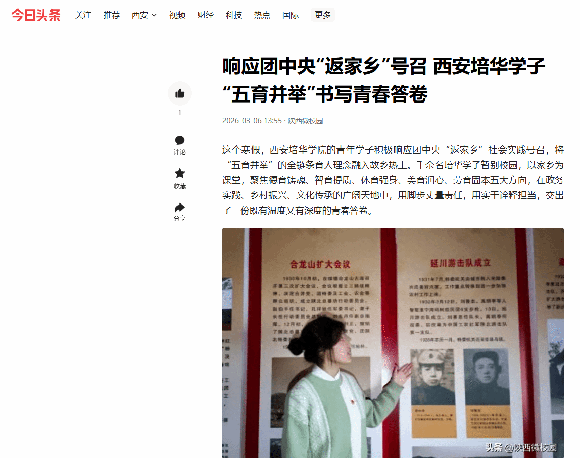 从红色纪念馆的深情凝望,到社区课堂的耐心教导;从冰雪赛场的奋力拼搏,到乡村一线的躬身劳作。这个寒假,西安培华学院的学子们用脚步重新认识家乡,用专业服务家乡,用爱心温暖家乡。这些生动的实践故事,既是学校深化“五育并举”、落实立德树人根本任务的鲜活注脚,更是培华青年将个人理想融入家乡发展、响应“青春为中国式现代化挺膺担当”的铿锵誓言。当青春的脚步从校园迈向家乡,与时代的脉搏同频共振,这场“返家乡”的奔赴,已然成为他们最深刻的成长礼。