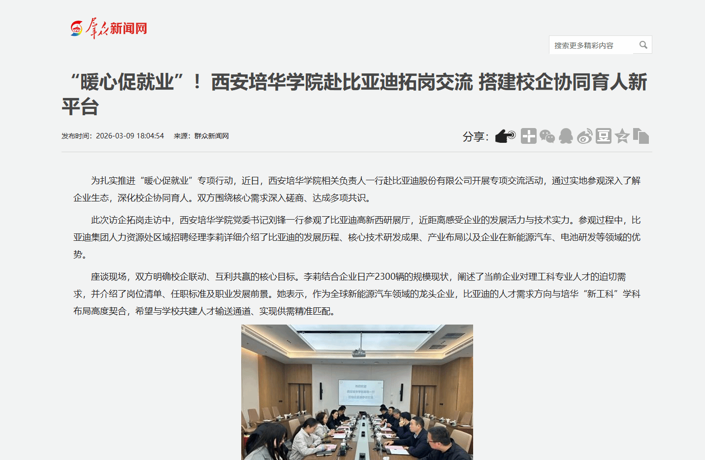 为扎实推进“暖心促就业”专项行动,近日,西安培华学院相关负责人一行赴比亚迪股份有限公司开展专项交流活动,通过实地参观深入了解企业生态,深化校企协同育人。双方围绕核心需求深入磋商、达成多项共识。
