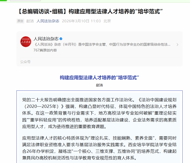 西安培华学院法学专业已经构建起涵盖办学定位、课程体系、教学模式、产教融合、师资建设、质量评价的全方位应用型人才培养体系,形成了以“理论与实践并重,专业与前沿融合”为核心的应用型法律人才培养“培华范式”,实现了人才培养供给侧与行业需求侧的精准对接,为民办高校法学专业转型发展提供了可借鉴的实践样本。