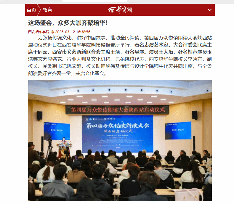 在西安培华学院成功举办的第四届万众悦读朗读大会陕西站启动仪式,既是一场高水平的文化盛会,也是学校深耕语言艺术教育的重要实践。以此为契机,学校为播音学子搭建了与行业名家交流的平台,让同学们在实战中感受艺术魅力。随着赛事全面展开,学校将继续坚持以赛促学、以赛育人,引导学子在锤炼专业本领的同时,用声音讲好中国故事、陕西故事。未来,培华将进一步深化产教融合,为传承中华优秀传统文化、推动全民阅读贡献培华力量。