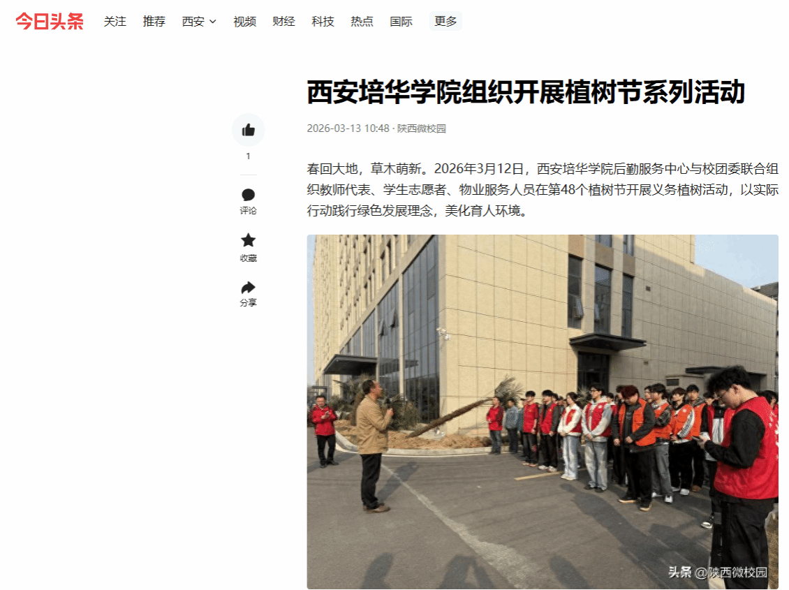 春回大地,草木萌新。2026年3月12日,西安培华学院后勤服务中心与校团委联合组织教师代表、学生志愿者、物业服务人员在第48个植树节开展义务植树活动,以实际行动践行绿色发展理念,美化育人环境。