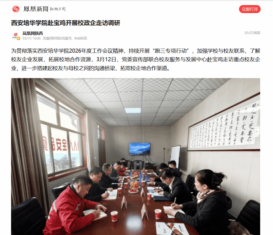 为贯彻落实西安培华学院2026年度工作会议精神,持续开展“跑三专项行动”,加强学校与校友联系,了解校友企业发展,拓展校地合作资源,3月12日,党委宣传部联合校友服务与发展中心赴宝鸡走访重点校友企业,进一步搭建起校友与母校之间的沟通桥梁,拓宽校企地合作渠道。
