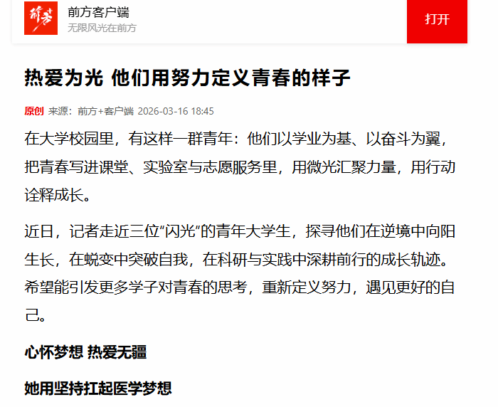 在大学校园里,有这样一群青年:他们以学业为基、以奋斗为翼,把青春写进课堂、实验室与志愿服务里,用微光汇聚力量,用行动诠释成长。