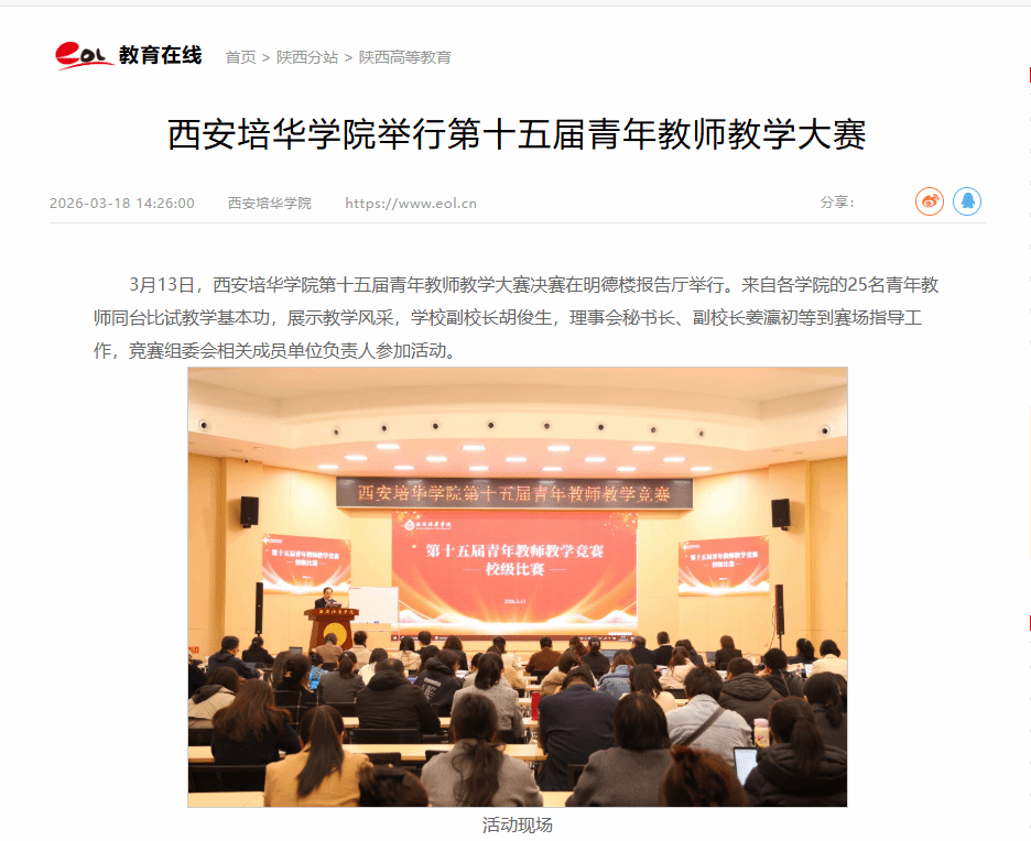 3月13日,西安培华学院第十五届青年教师教学大赛决赛在明德楼报告厅举行。来自各学院的25名青年教师同台比试教学基本功,展示教学风采,学校副校长胡俊生,理事会秘书长、副校长姜瀛初等到赛场指导工作,竞赛组委会相关成员单位负责人参加活动。