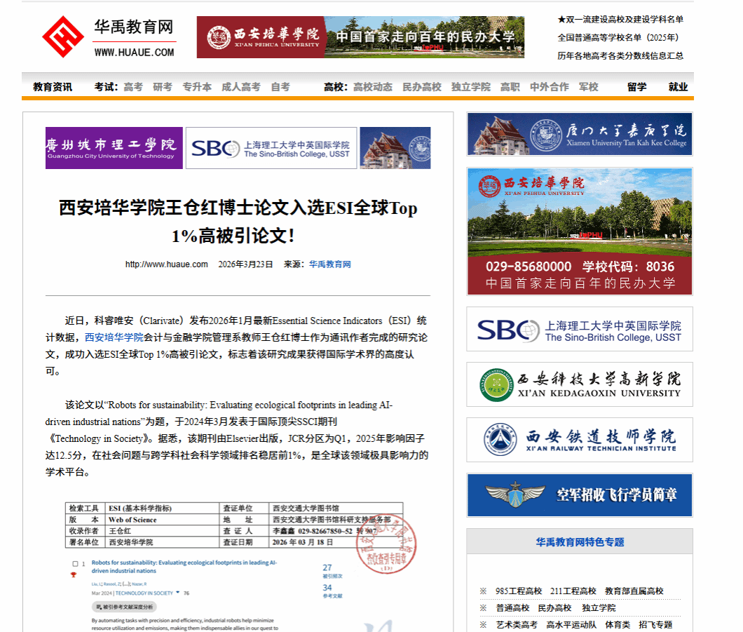 近日,科睿唯安(Clarivate)发布2026年1月最新Essential Science Indicators(ESI)统计数据,西安培华学院会计与金融学院管理系教师王仓红博士作为通讯作者完成的研究论文,成功入选ESI全球Top 1%高被引论文,标志着该研究成果获得国际学术界的高度认可。