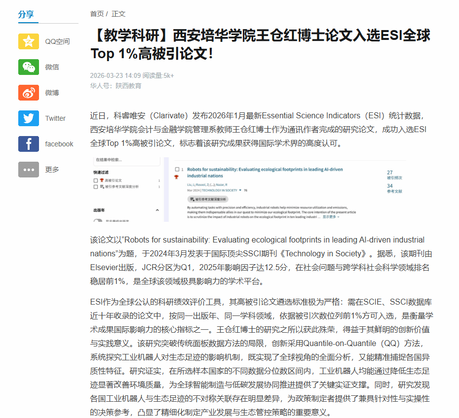 近日,科睿唯安(Clarivate)发布2026年1月最新Essential Science Indicators(ESI)统计数据,西安培华学院会计与金融学院管理系教师王仓红博士作为通讯作者完成的研究论文,成功入选ESI全球Top 1%高被引论文,标志着该研究成果获得国际学术界的高度认可。