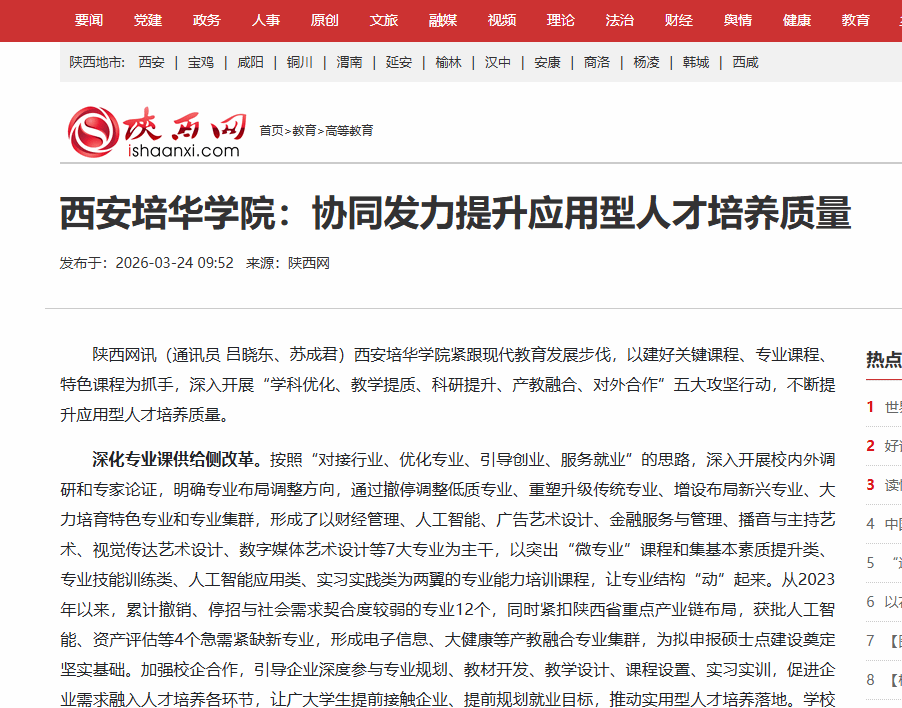 深化专业课供给侧改革。按照“对接行业、优化专业、引导创业、服务就业”的思路,深入开展校内外调研和专家论证,明确专业布局调整方向,通过撤停调整低质专业、重塑升级传统专业、增设布局新兴专业、大力培育特色专业和专业集群,形成了以财经管理、人工智能、广告艺术设计、金融服务与管理、播音与主持艺术、视觉传达艺术设计、数字媒体艺术设计等7大专业为主干,以突出“微专业”课程和集基本素质提升类、专业技能训练类、人工智能应用类、实习实践类为两翼的专业能力培训课程,让专业结构“动”起来。从2023年以来,累计撤销、停招与社会需求契合度较弱的专业12个,同时紧扣陕西省重点产业链布局,获批人工智能、资产评估等4个急需紧缺新专业,形成电子信息、大健康等产教融合专业集群,为拟申报硕士点建设奠定坚实基础。加强校企合作,引导企业深度参与专业规划、教材开发、教学设计、课程设置、实习实训,促进企业需求融入人才培养各环节,让广大学生提前接触企业、提前规划就业目标,推动实用型人才培养落地。学校已携手企业联袂打造70门校企合作共建共讲课程,累计超过300个行业企业课程资源库与6000多个实战案例,同时建立了276个校外实习实训基地,建立了华夏鲲鹏信创产业学院、低空经济航空产业学院、新电商产业学院、华为ICT现代产业学院、生态商科产业学院、数智传媒产业学院、生物医药现代产业学院等11个产业学院。近三年学校本科生获省级以上竞赛奖项2635项,累计获奖学生5843人次。农学、经济学、工学三个学科通过普通高校本科专业省级评议。