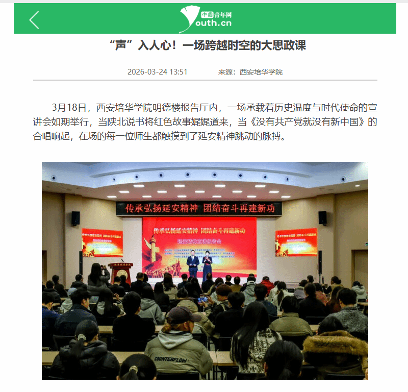 此次宣讲报告会,既是一次深刻的红色教育,也是一场有力的思想动员。西安培华学院将以此次活动为契机,把延安精神深度融入“大思政课”建设全过程,丰富育人载体、创新教学形式、强化实践引领,持续推动延安精神进校园、进课堂、进头脑,引导全体师生从延安精神中汲取信仰力量、筑牢初心使命,切实把学习成果转化为担当作为、实干笃行的强大动力,在新时代新征程上团结奋斗、再建新功。