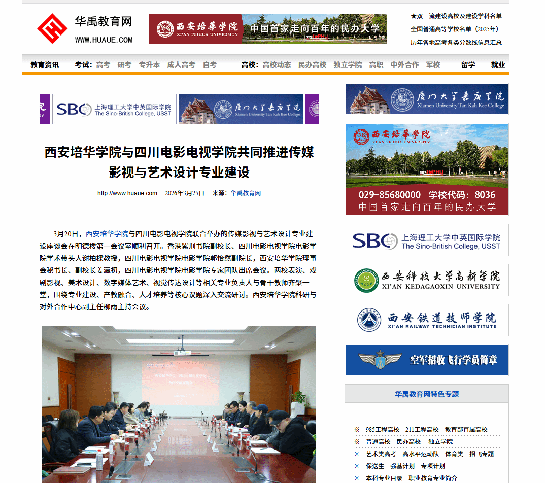 谢柏樑教授对西安培华学院的热情接待表示感谢,并介绍了四川电影电视学院的办学定位与办学特色。该校深耕传媒影视领域30余年,学科专业建设成果丰硕,为行业培养了大批优秀人才。郭怡然副院长分享了学校在实践教学、产教融合方面的创新举措,重点介绍了校内影视文创城建设、协同育人机制,以及微短剧创作、AI融合影视教学等新兴领域的探索成果。