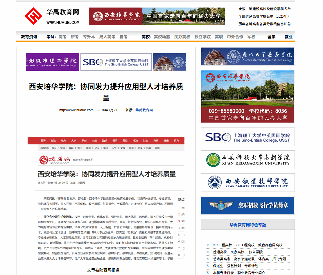 深化专业课供给侧改革。按照“对接行业、优化专业、引导创业、服务就业”的思路,深入开展校内外调研和专家论证,明确专业布局调整方向,通过撤停调整低质专业、重塑升级传统专业、增设布局新兴专业、大力培育特色专业和专业集群,形成了以财经管理、人工智能、广告艺术设计、金融服务与管理、播音与主持艺术、视觉传达艺术设计、数字媒体艺术设计等7大专业为主干,以突出“微专业”课程和集基本素质提升类、专业技能训练类、人工智能应用类、实习实践类为两翼的专业能力培训课程,让专业结构“动”起来。从2023年以来,累计撤销、停招与社会需求契合度较弱的专业12个,同时紧扣陕西省重点产业链布局,获批人工智能、资产评估等4个急需紧缺新专业,形成电子信息、大健康等产教融合专业集群,为拟申报硕士点建设奠定坚实基础。加强校企合作,引导企业深度参与专业规划、教材开发、教学设计、课程设置、实习实训,促进企业需求融入人才培养各环节,让广大学生提前接触企业、提前规划就业目标,推动实用型人才培养落地。学校已携手企业联袂打造70门校企合作共建共讲课程,累计超过300个行业企业课程资源库与6000多个实战案例,同时建立了276个校外实习实训基地,建立了华夏鲲鹏信创产业学院、低空经济航空产业学院、新电商产业学院、华为ICT现代产业学院、生态商科产业学院、数智传媒产业学院、生物医药现代产业学院等11个产业学院。近三年学校本科生获省级以上竞赛奖项2635项,累计获奖学生5843人次。农学、经济学、工学三个学科通过普通高校本科专业省级评议。