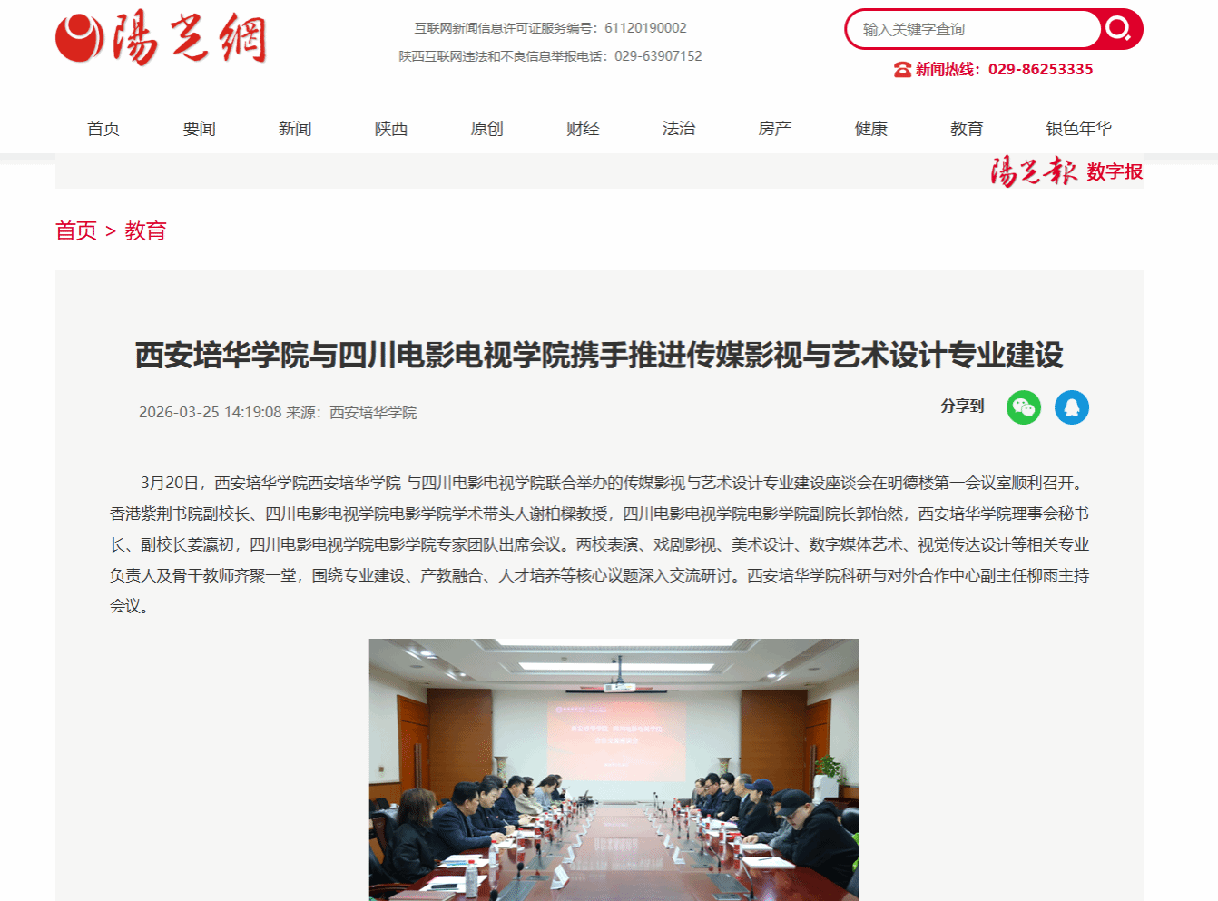3月20日,西安培华学院西安培华学院 与四川电影电视学院联合举办的传媒影视与艺术设计专业建设座谈会在明德楼第一会议室顺利召开。香港紫荆书院副校长、四川电影电视学院电影学院学术带头人谢柏樑教授,四川电影电视学院电影学院副院长郭怡然,西安培华学院理事会秘书长、副校长姜瀛初,四川电影电视学院电影学院专家团队出席会议。两校表演、戏剧影视、美术设计、数字媒体艺术、视觉传达设计等相关专业负责人及骨干教师齐聚一堂,围绕专业建设、产教融合、人才培养等核心议题深入交流研讨。西安培华学院科研与对外合作中心副主任柳雨主持会议。
