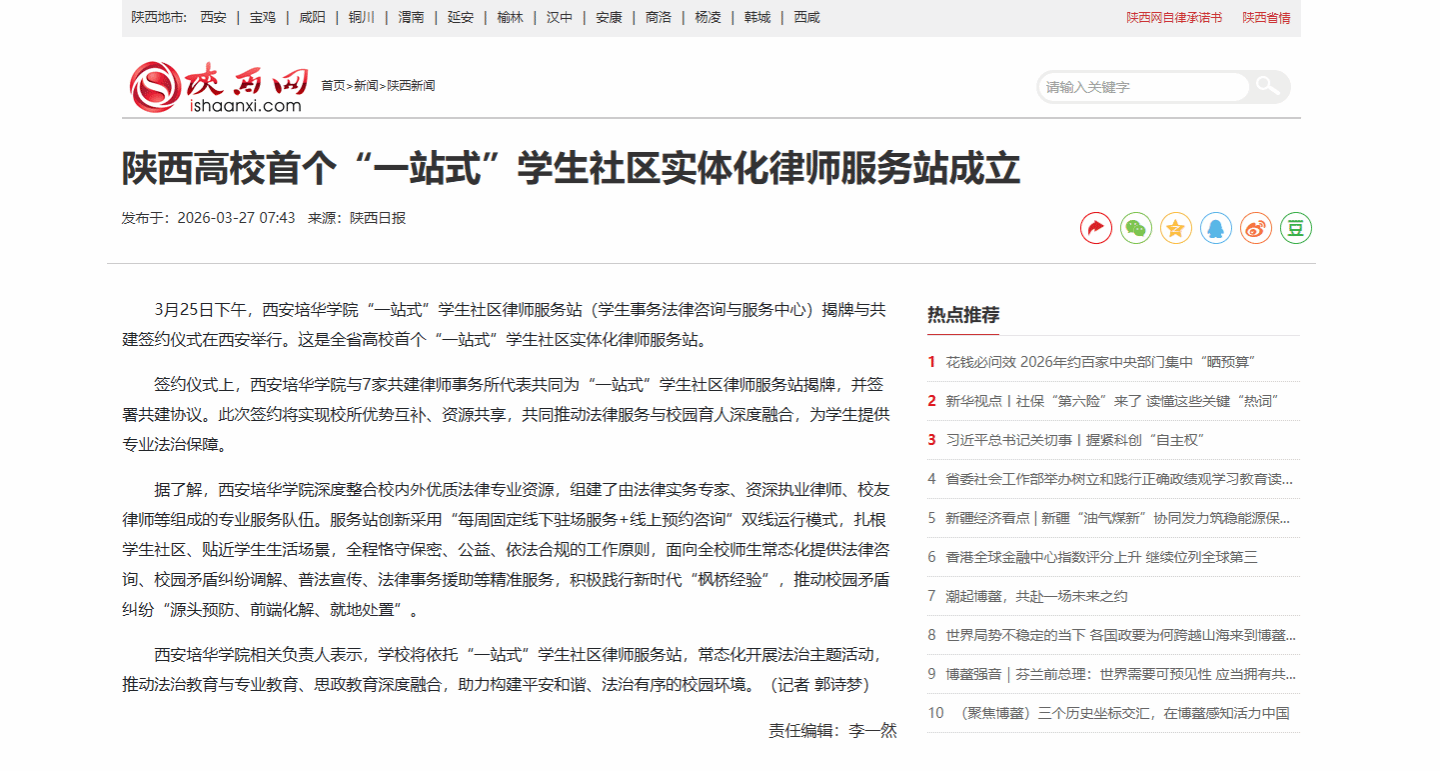 3月25日下午,西安培华学院“一站式”学生社区律师服务站(学生事务法律咨询与服务中心)揭牌与共建签约仪式在西安举行。这是全省高校首个“一站式”学生社区实体化律师服务站。