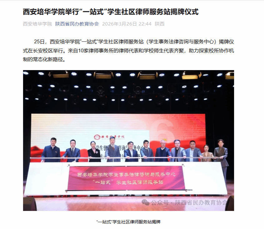 25日,西安培华学院“一站式”学生社区律师服务站(学生事务法律咨询与服务中心)揭牌仪式在长安校区举行。来自10家律师事务所的律师代表和学校师生代表齐聚,助力探索校所协作机制的常态化新路径。