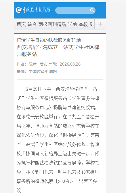 3月25日下午,西安培华学院“一站式”学生社区律师服务站(学生事务法律咨询与服务中心)揭牌与共建签约仪式,在该校长安校区举行。在“九五”普法开局之年,律师服务站的成立标志着学校在深化依法治校、深化“枫桥经验”、完善“一站式”学生社区综合服务体系、构建校所协同育人新格局上迈出关键一步,成为筑牢校园法治护航的重要屏障。学校领导、相关部门代表、师生代表及10家律师事务所的律师代表共300余人,出席了会议。