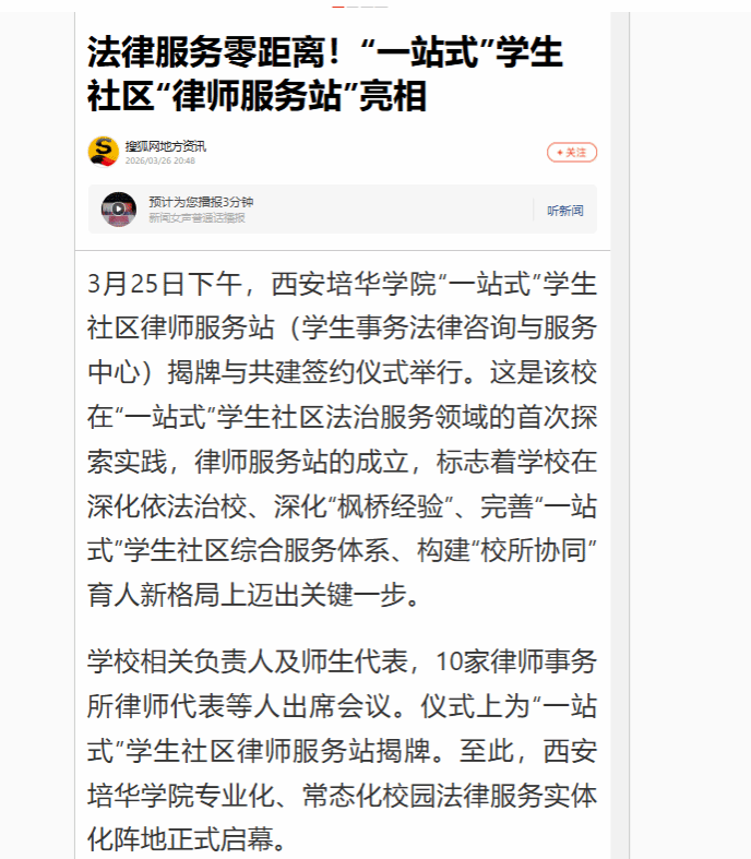 3月25日下午,西安培华学院“一站式”学生社区律师服务站(学生事务法律咨询与服务中心)揭牌与共建签约仪式举行。这是该校在“一站式”学生社区法治服务领域的首次探索实践,律师服务站的成立,标志着学校在深化依法治校、深化“枫桥经验”、完善“一站式”学生社区综合服务体系、构建“校所协同”育人新格局上迈出关键一步。学校相关负责人及师生代表,10家律师事务所律师代表等人出席会议。仪式上为“一站式”学生社区律师服务站揭牌。至此,西安培华学院专业化、常态化校园法律服务实体化阵地正式启幕。