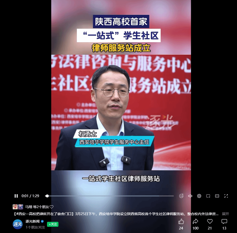3月25日下午,西安培华学院设立陕西省高校首个学生社区律师服务站,整合校内外法律资源为学生提供免费维权咨询、普法教育和实习实践服务,成为陕西高校法治校园建设的新突破。作为学校在"一站式"学生社区法治服务领域的首次探索性实践,该律师服务站的成立,标志着学校在深化依法治校,深化“枫桥经验”、完善"一站式“学生社区综合服务体系、构建”校所协同"育人新格局上迈出关键一步,成为筑牢校园法治护航的重要屏障。