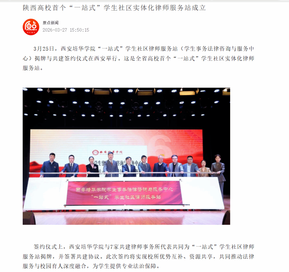 3月25日,西安培华学院“一站式”学生社区律师服务站(学生事务法律咨询与服务中心)揭牌与共建签约仪式在西安举行。这是全省高校首个“一站式”学生社区实体化律师服务站。