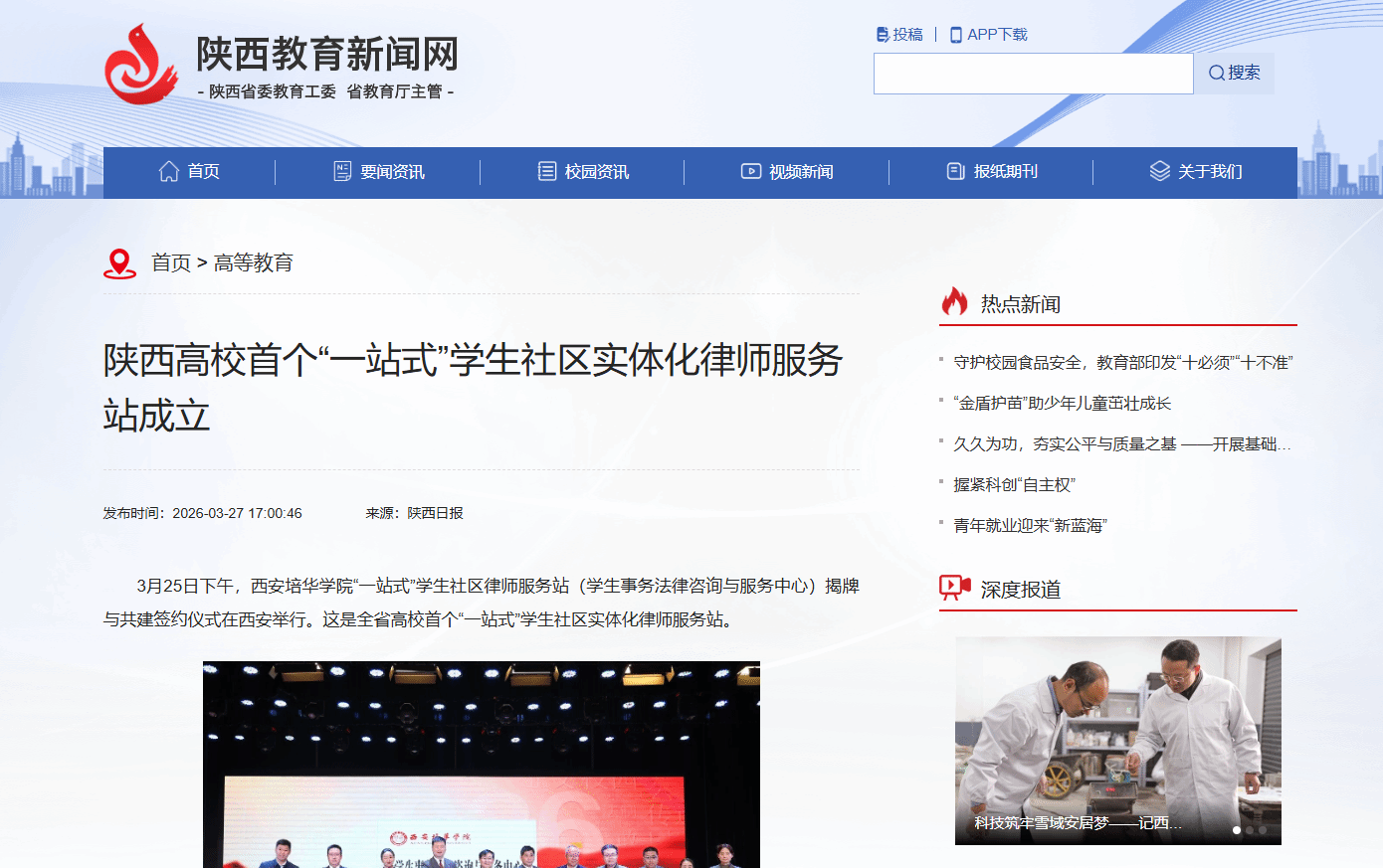3月25日下午,西安培华学院“一站式”学生社区律师服务站(学生事务法律咨询与服务中心)揭牌与共建签约仪式在西安举行。这是全省高校首个“一站式”学生社区实体化律师服务站。
