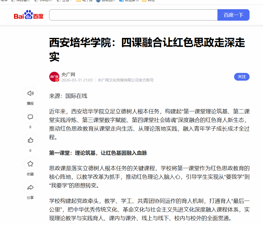 近年来,西安培华学院立足立德树人根本任务,构建起“第一课堂理论筑基、第二课堂实践淬炼、第三课堂数字赋能、第四课堂社会铸魂”深度融合的红色育人新生态,推动红色思政教育从课堂走向生活、从理论落地实践,融入青年学子成长成才全过程。