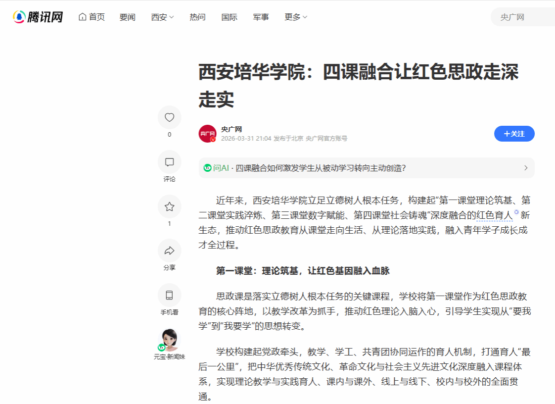 近年来,西安培华学院立足立德树人根本任务,构建起“第一课堂理论筑基、第二课堂实践淬炼、第三课堂数字赋能、第四课堂社会铸魂”深度融合的红色育人新生态,推动红色思政教育从课堂走向生活、从理论落地实践,融入青年学子成长成才全过程。