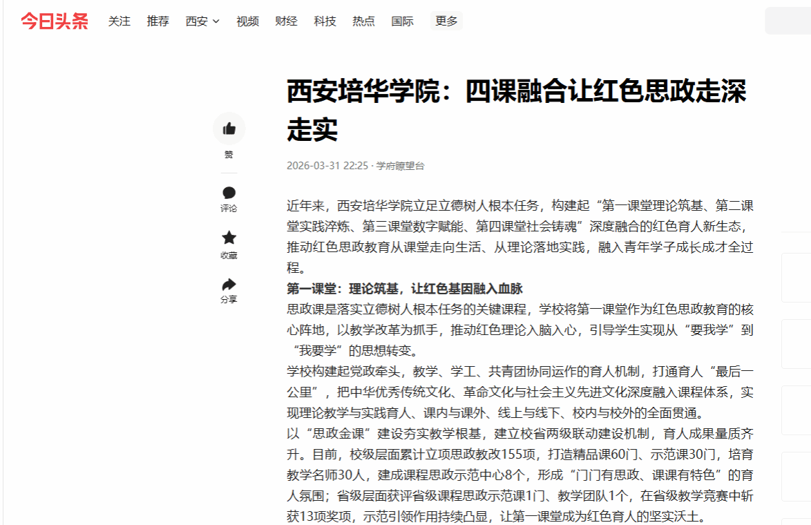 近年来,西安培华学院立足立德树人根本任务,构建起“第一课堂理论筑基、第二课堂实践淬炼、第三课堂数字赋能、第四课堂社会铸魂”深度融合的红色育人新生态,推动红色思政教育从课堂走向生活、从理论落地实践,融入青年学子成长成才全过程。