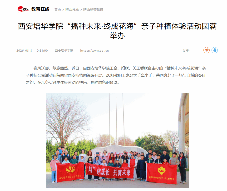 春风送暖,绿意盎然。近日,由西安培华学院工会、妇联、关工委联合主办的“播种未来·终成花海”亲子种植公益活动在陕西省西安植物园温暖开展。20组教职工家庭大手牵小手,共同奔赴了一场与自然的春日之约,在亲身实践中体验劳动的快乐,播种绿色的希望。