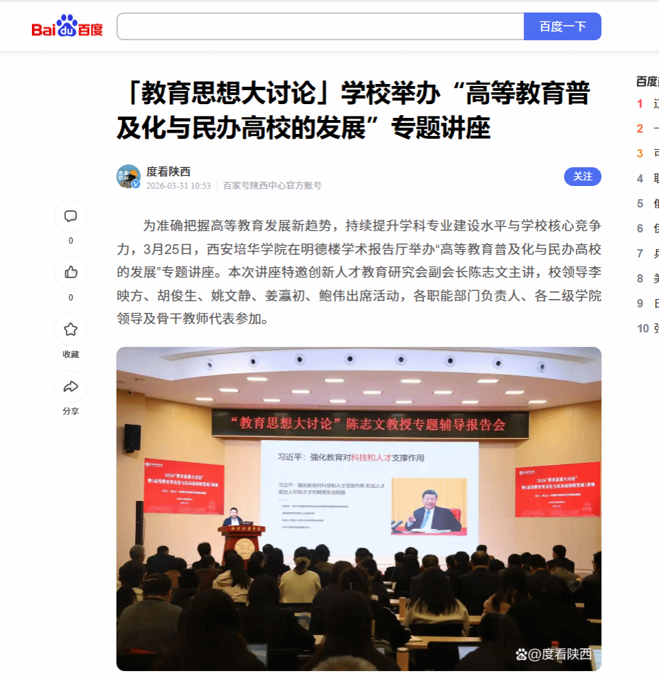为准确把握高等教育发展新趋势,持续提升学科专业建设水平与学校核心竞争力,3月25日,西安培华学院在明德楼学术报告厅举办“高等教育普及化与民办高校的发展”专题讲座。本次讲座特邀创新人才教育研究会副会长陈志文主讲,校领导李映方、胡俊生、姚文静、姜瀛初、鲍伟出席活动,各职能部门负责人、各二级学院领导及骨干教师代表参加。
