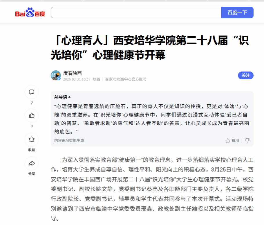 心理健康是大学生成长成才的重要基石。西安培华学院于2024年成功获批陕西省大中小幼一体化心理健康教育工作试点高校,长期以来积极推进大中小学心理健康教育协同共建。