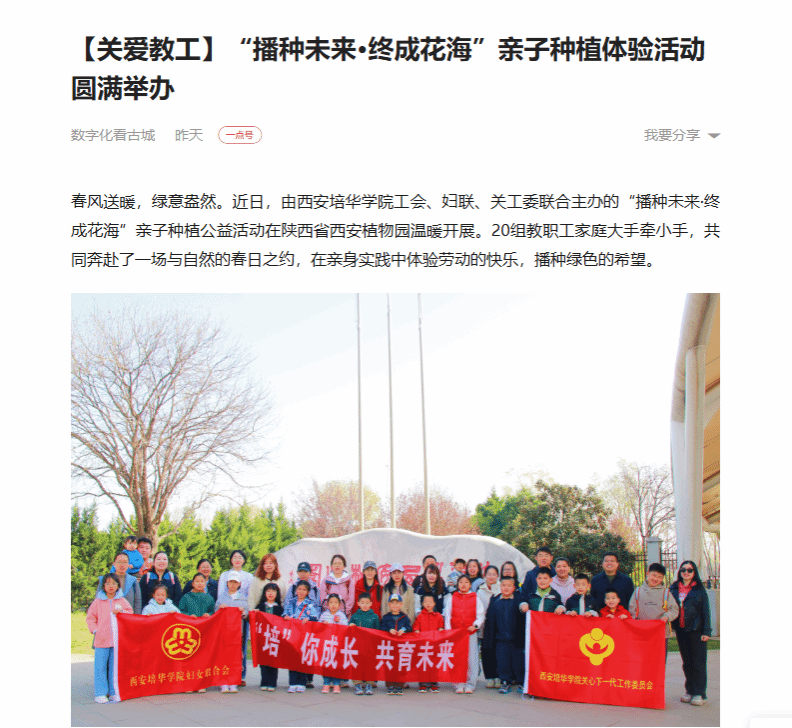 春风送暖,绿意盎然。近日,由西安培华学院工会、妇联、关工委联合主办的“播种未来·终成花海”亲子种植公益活动在陕西省西安植物园温暖开展。20组教职工家庭大手牵小手,共同奔赴了一场与自然的春日之约,在亲身实践中体验劳动的快乐,播种绿色的希望。