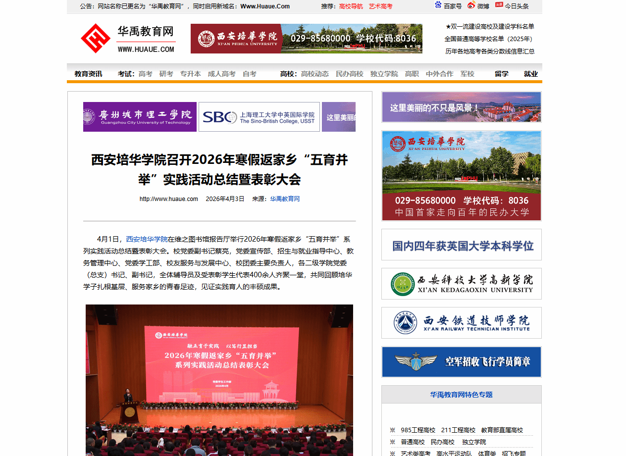 4月1日,西安培华学院在维之图书馆报告厅举行2026年寒假返家乡“五育并举”系列实践活动总结暨表彰大会。校党委副书记蔡亮,党委宣传部、招生与就业指导中心、教务管理中心、党委学工部、校友服务与发展中心、校团委主要负责人,各二级学院党委(总支)书记、副书记,全体辅导员及受表彰学生代表400余人齐聚一堂,共同回顾培华学子扎根基层、服务家乡的青春足迹,见证实践育人的丰硕成果。