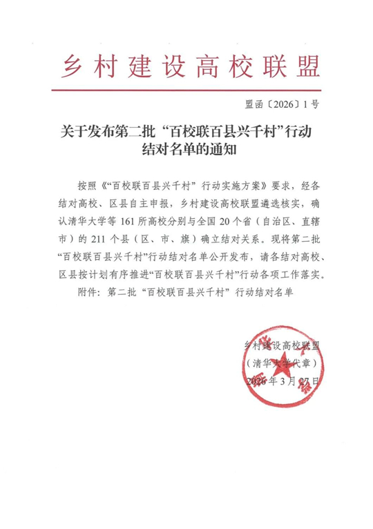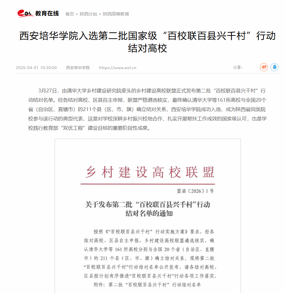 3月27日,由清华大学乡村建设研究院牵头的乡村建设高校联盟正式发布第二批“百校联百县兴千村”行动结对名单。经各结对高校、区县自主申报,联盟严格遴选核实,最终确认清华大学等161所高校与全国20个省(自治区、直辖市)的211个县(区、市、旗)确立结对关系,西安培华学院成功入选,成为陕西省同类院校参与该行动的典型代表,这是对学校深耕乡村振兴校地合作、扎实开展帮扶工作成效的国家级认可,也是学校践行教育部“双优工程”建设目标的重要阶段性成果。