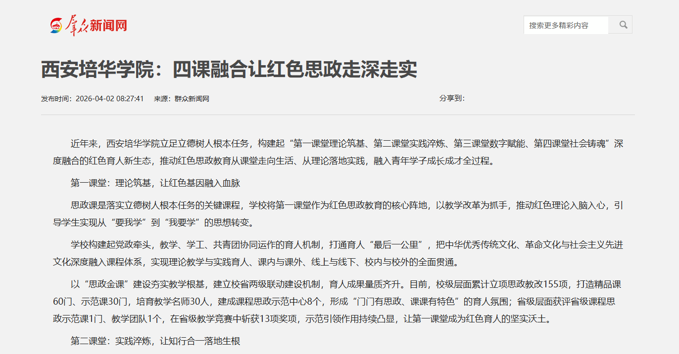 近年来,西安培华学院立足立德树人根本任务,构建起“第一课堂理论筑基、第二课堂实践淬炼、第三课堂数字赋能、第四课堂社会铸魂”深度融合的红色育人新生态,推动红色思政教育从课堂走向生活、从理论落地实践,融入青年学子成长成才全过程。