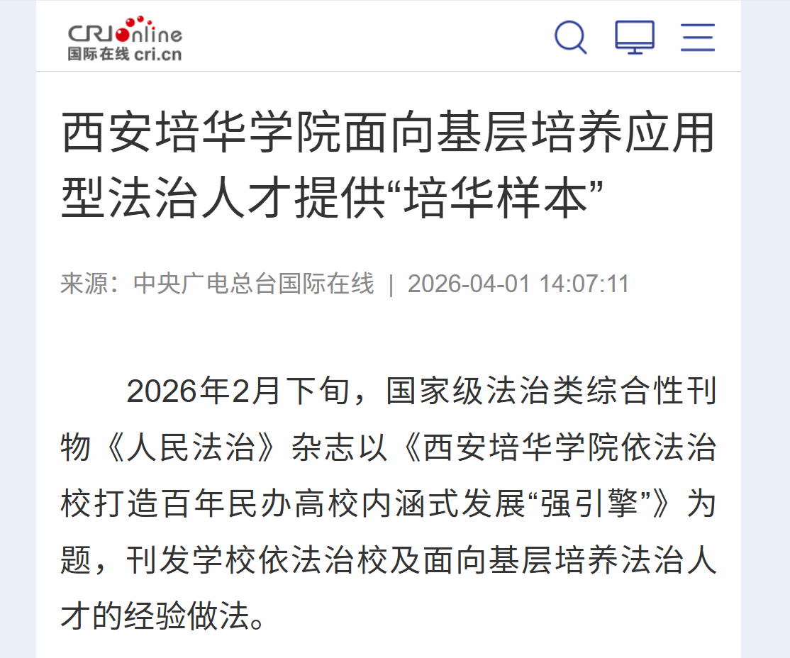 2026年2月下旬,国家级法治类综合性刊物《人民法治》杂志以《西安培华学院依法治校打造百年民办高校内涵式发展“强引擎”》为题,大篇幅刊发学校依法治校及面向基层培养法治人才的经验做法。学校理事长姜波、法学院院长王鸿貌接受杂志总编梁相斌专访,系统介绍了学校依法治校和法治人才培养的探索实践。学校在法治育人方面的创新举措,获得省委主要领导批示肯定。