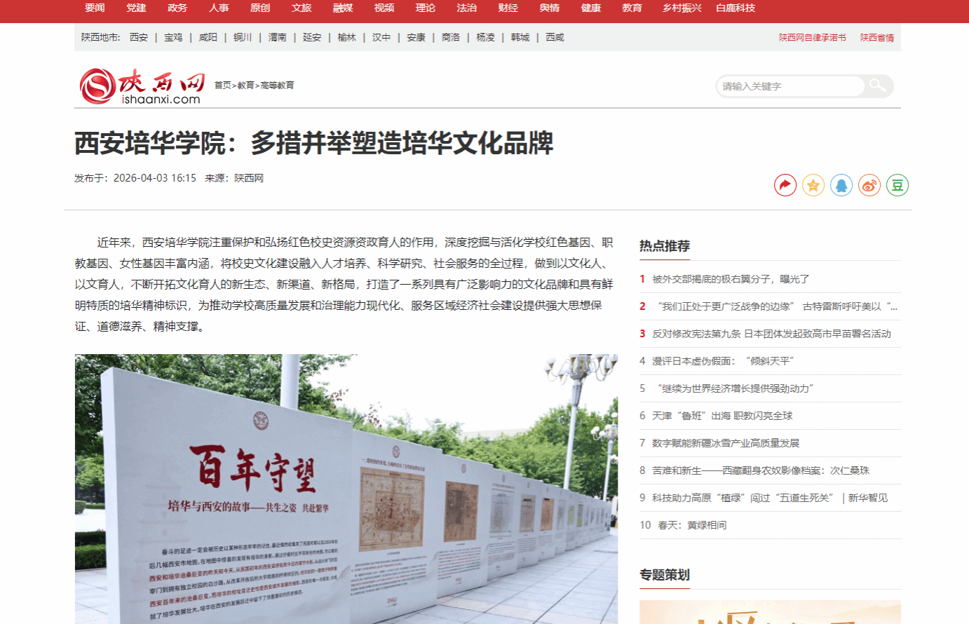 近年来,西安培华学院注重保护和弘扬红色校史资源资政育人的作用,深度挖掘与活化学校红色基因、职教基因、女性基因丰富内涵,将校史文化建设融入人才培养、科学研究、社会服务的全过程,做到以文化人、以文育人,不断开拓文化育人的新生态、新渠道、新格局,打造了一系列具有广泛影响力的文化品牌和具有鲜明特质的培华精神标识,为推动学校高质量发展和治理能力现代化、服务区域经济社会建设提供强大思想保证、道德滋养、精神支撑。