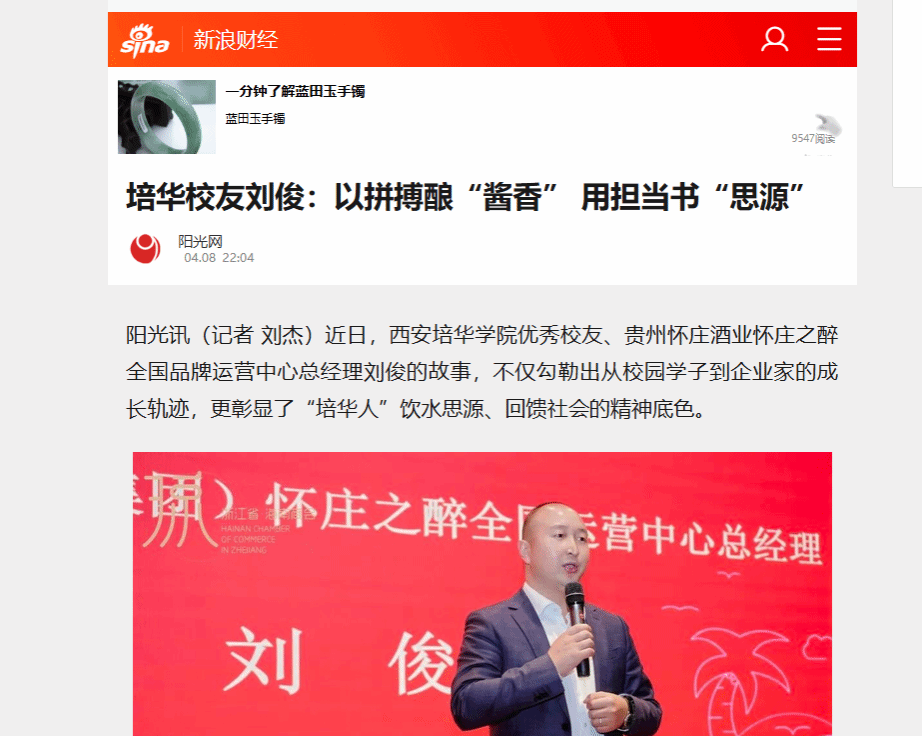 阳光讯(记者 刘杰)近日,西安培华学院优秀校友、贵州怀庄酒业怀庄之醉全国品牌运营中心总经理刘俊的故事,不仅勾勒出从校园学子到企业家的成长轨迹,更彰显了“培华人”饮水思源、回馈社会的精神底色。