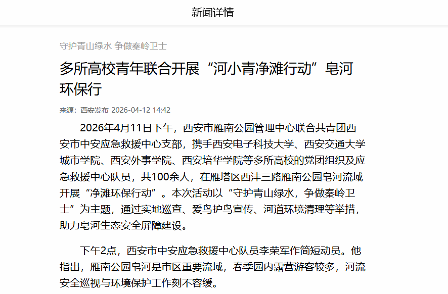 2026年4月11日下午,西安市雁南公园管理中心联合共青团西安市中安应急救援中心支部,携手西安电子科技大学、西安交通大学城市学院、西安外事学院、西安培华学院等多所高校的党团组织及应急救援中心队员,共100余人,在雁塔区西沣三路雁南公园皂河流域开展“净滩环保行动”。本次活动以“守护青山绿水,争做秦岭卫士”为主题,通过实地巡查、爱鸟护鸟宣传、河道环境清理等举措,助力皂河生态安全屏障建设。