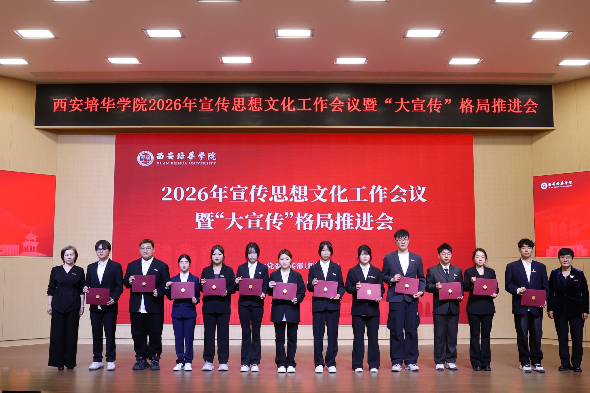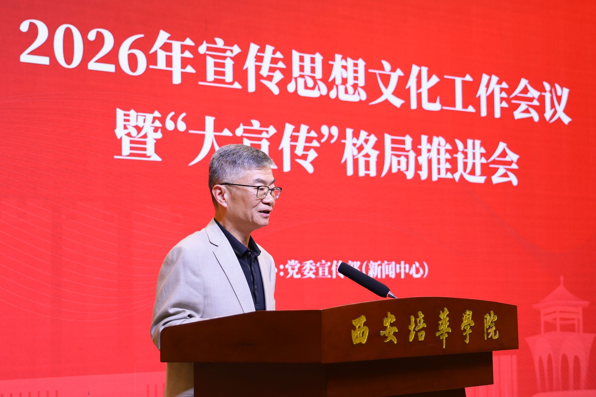 4月10日下午,西安培华学院2026年宣传思想文化工作会议暨“大宣传”格局推进会在长安校区举行。会议分析研究当前宣传思想工作的形势和任务,系统部署2026年重点任务,加快构建全员参与、全域协同、全程发力的“大宣传”工作格局,为学校高质量发展筑牢思想根基、营造良好舆论氛围。