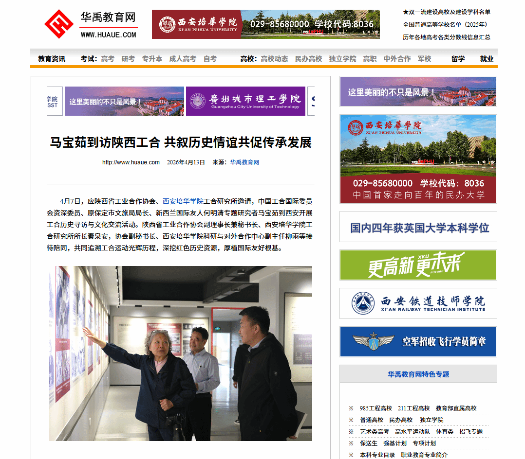 4月7日,应陕西省工业合作协会、西安培华学院工合研究所邀请,中国工合国际委员会资深委员、原保定市文旅局局长、新西兰国际友人何明清专题研究者马宝茹到西安开展工合历史寻访与文化交流活动。陕西省工业合作协会副理事长兼秘书长、西安培华学院工合研究所所长秦泉安,协会副秘书长、西安培华学院科研与对外合作中心副主任柳雨等接待陪同,共同追溯工合运动光辉历程,深挖红色历史资源,厚植国际友好根基。