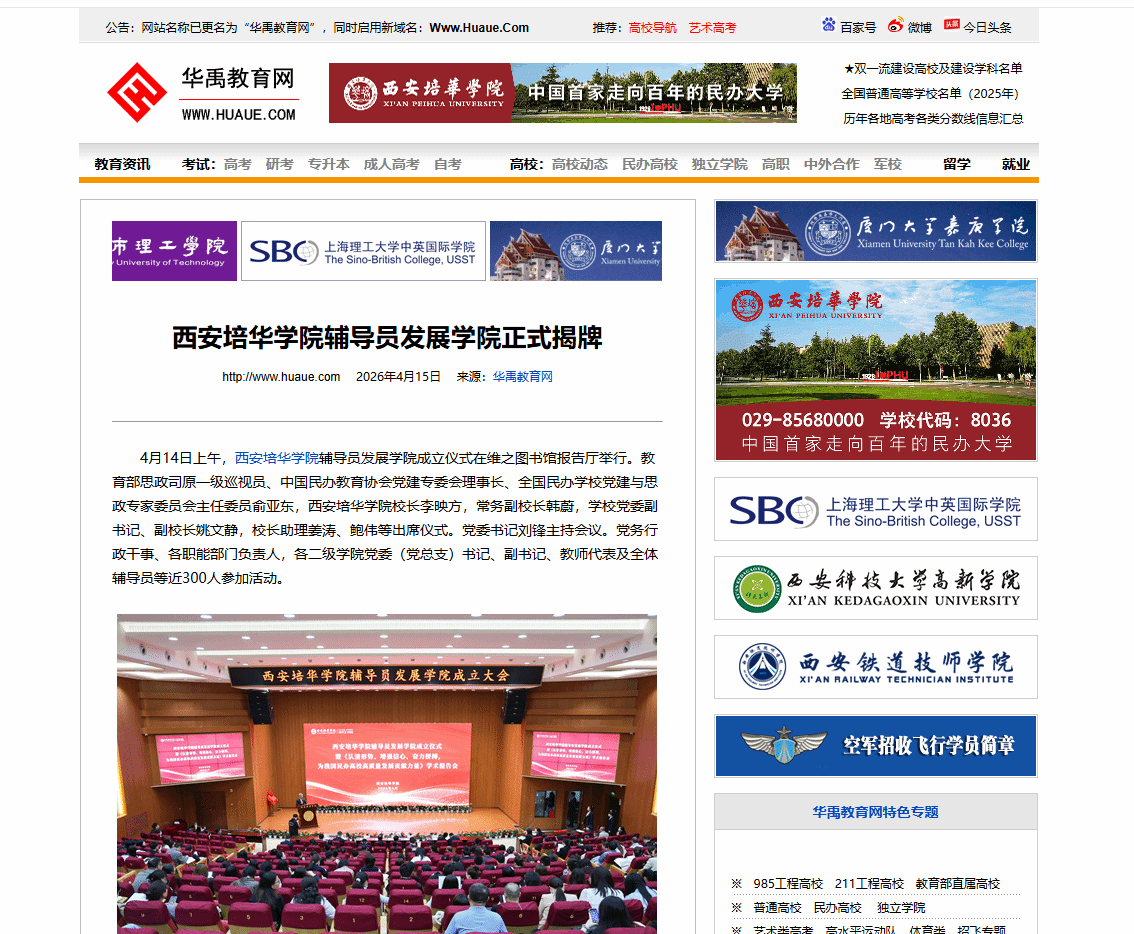 西安培华学院辅导员发展学院,是陕西高校中首个实体化运行的辅导员专职培养机构。学院深入贯彻落实《全面加强新时代高校辅导员队伍建设行动方案》精神,是学校着力建强新时代高校思想政治工作“第四支队伍”的标志性实践举措。学院下设辅导员发展研究中心、辅导员培训与培养中心、辅导员实践创新中心,聚焦“新苗—成长—骨干—专家”分层分类培养,模块化精品课程体系构建、辅导员工作室与特色项目孵化、科研赋能与实践创新融合四大核心任务系统发力。(作者:苏成君)