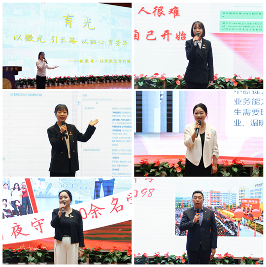 辅导员秦佳宁以“启光”为核心,生动讲述了她用真诚与坚持,陪伴一名英语严重偏科学生重拾学习信心、最终顺利通过考试的暖心故事。她以真心换真心,用耐心与陪伴点亮学生成长之路,引发与会人员强烈共鸣,获得一致好评。辅导员郝甜甜以“承光”为主题,分享了她与学生小徐携手备战职业规划大赛的成长历程。从院赛突围到省赛角逐,她以师者初心引路护航,学生以青春姿态奋力前行,师生同心同向、彼此成就。真挚而饱满的讲述打动全场,赢得阵阵掌声。辅导员寇方译以“传光”为题,分享了一名女生从怯场迷茫到蜕变为“发光者”的成长故事,让她深刻读懂了辅导员作为高校“第四支队伍”,开展大学生思想政治教育工作的社会责任感、光荣感和使命感。辅导员范静毅以“守光”为题,讲述了她用八年时光守护和助力700余名学子“成人、成才、成功”的感人故事,特别是用爱心、热心陪伴残疾且患有严重癫痫的吴同学跨越成长难关,最终该生获评“全国大学生自强之星”,并扎根基层残联工作。辅导员王迪以“聚光”为题,生动讲述了在辅导员岗位工作十八载,陪伴学生从迷茫走向入党并成长为基层公务员的点点滴滴。“如果再给我一次机会,我依然会选择做那个高举火把的引路人”道出了他的育人初心。