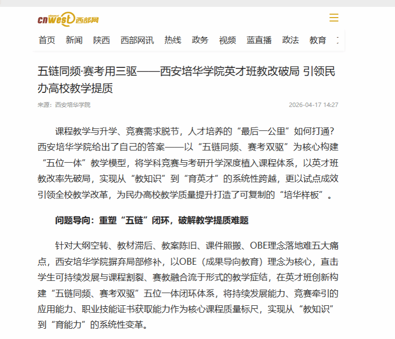 课程教学与升学、竞赛需求脱节,人才培养的“最后一公里”如何打通?西安培华学院给出了自己的答案——以“五链同频、赛考双驱”为核心构建“五位一体”教学模型,将学科竞赛与考研升学深度植入课程体系,以英才班教改率先破局,实现从“教知识”到“育英才”的系统性跨越,更以试点成效引领全校教学改革,为民办高校教学质量提升打造了可复制的“培华样板”。