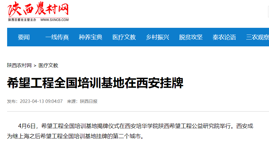 4月6日,希望工程全国培训基地揭牌仪式在西安培华学院陕西希望工程公益研究院举行。西安成为继上海之后希望工程全国培训基地挂牌的第二个城市。