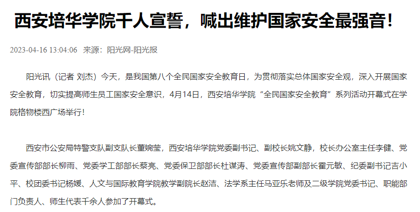 阳光讯(记者 刘杰)今天,是我国第八个全民国家安全教育日,为贯彻落实总体国家安全观,深入开展国家安全教育,切实提高师生员工国家安全意识,4月14日,西安培华学院“全民国家安全教育”系列活动开幕式在学院格物楼西广场举行!