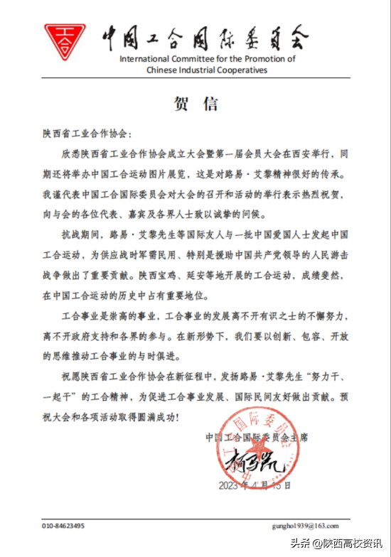 除此之外,中国工合国际委员会、河南省工业合作协会、甘肃省工业合作协会筹委会、路易艾黎研究中心等也向陕西工合的成立发来贺信,表示祝贺。