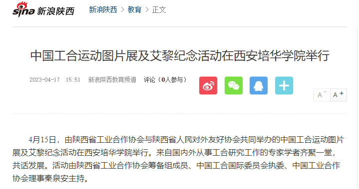 4月15日,由陕西省工业合作协会与陕西省人民对外友好协会共同举办的中国工合运动图片展及艾黎纪念活动在西安培华学院举行。来自国内外从事工合研究工作的专家学者齐聚一堂,共话发展。活动由陕西省工业合作协会筹备组成员、中国工合国际委员会执委、中国工业合作协会理事秦泉安主持。