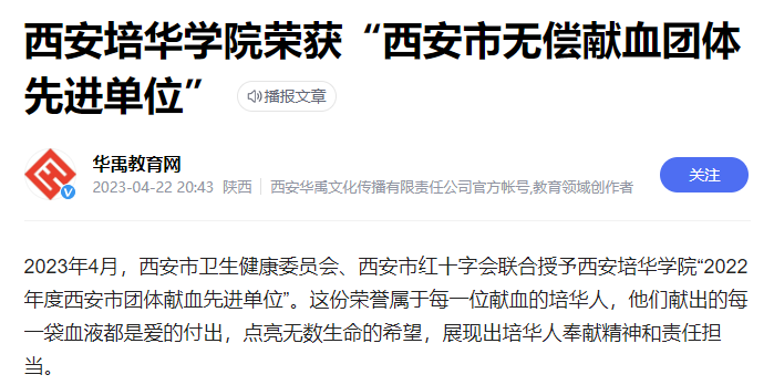 2023年4月,西安市卫生健康委员会、西安市红十字会联合授予西安培华学院“2022年度西安市团体献血先进单位”。这份荣誉属于每一位献血的培华人,他们献出的每一袋血液都是爱的付出,点亮无数生命的希望,展现出培华人奉献精神和责任担当。