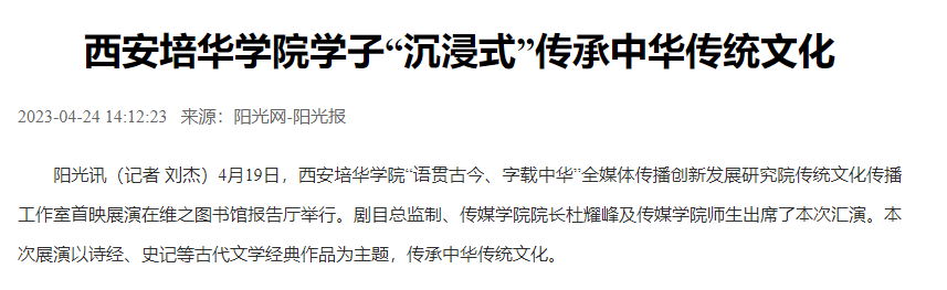 阳光讯(记者 刘杰)4月19日,西安培华学院“语贯古今、字载中华”全媒体传播创新发展研究院传统文化传播工作室首映展演在维之图书馆报告厅举行。剧目总监制、传媒学院院长杜耀峰及传媒学院师生出席了本次汇演。本次展演以诗经、史记等古代文学经典作品为主题,传承中华传统文化。