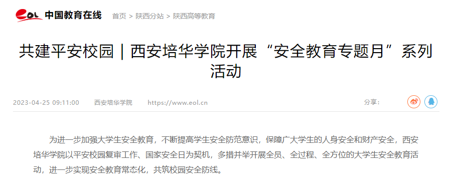 为进一步加强大学生安全教育,不断提高学生安全防范意识,保障广大学生的人身安全和财产安全,培华学院以平安校园复审工作、国家安全日为契机,多措并举开展全员、全过程、全方位的大学生安全教育活动,进一步实现安全教育常态化,共筑校园安全防线。