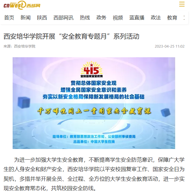 为进一步加强大学生安全教育,不断提高学生安全防范意识,保障广大学生的人身安全和财产安全,西安培华学院以平安校园复审工作、国家安全日为契机,多措并举开展全员、全过程、全方位的大学生安全教育活动,进一步实现安全教育常态化,共筑校园安全防线。