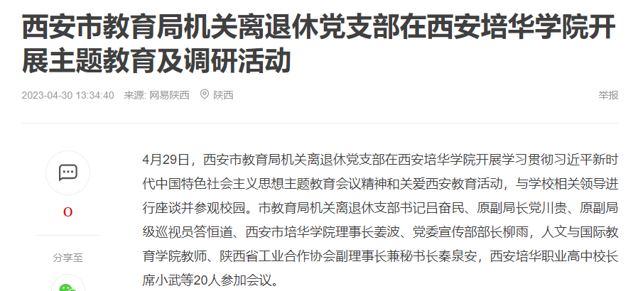4月29日,西安市教育局机关离退休党支部在西安培华学院开展学习贯彻习近平新时代中国特色社会主义思想主题教育会议精神和关爱西安教育活动,与学校相关领导进行座谈并参观校园。市教育局机关离退休支部书记吕奋民、原副局长党川贵、原副局级巡视员答恒道、西安市培华学院理事长姜波、党委宣传部部长柳雨,人文与国际教育学院教师、陕西省工业合作协会副理事长兼秘书长秦泉安,西安培华职业高中校长席小武等20人参加会议。
